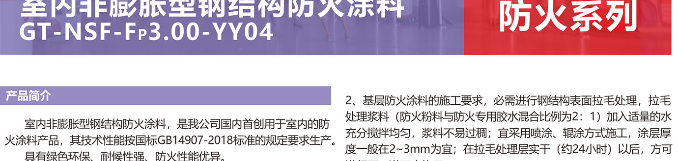 室內(nèi)非膨脹型鋼結(jié)構(gòu)防火涂料,是我公司國內(nèi)首創(chuàng)用于室內(nèi)的防火涂料產(chǎn)品,其技術(shù)性能按國標(biāo)GB14907-2018標(biāo)準(zhǔn)的規(guī)定要求生產(chǎn)。 具有綠色環(huán)保、耐候性強(qiáng)、防火性能優(yōu)異。 應(yīng)用范圍:高層鋼結(jié)構(gòu)建筑、工業(yè)鋼結(jié)構(gòu)廠房、機(jī)場火車站、石油化工、防火墻、體育場館等室內(nèi)鋼結(jié)構(gòu)框架的梁、柱防火保護(hù)。